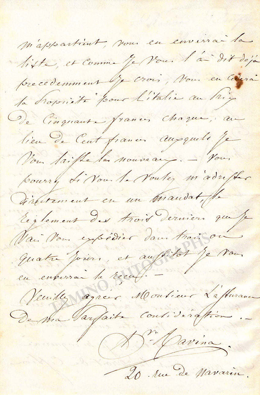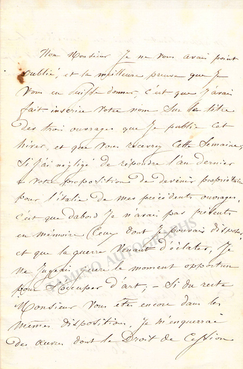 Autograph letter in French signed by him, no year mentioned, addressing a gentleman about selling his royalties and property rights of some of his works in Italy for an amount of money.  Size is 5.2 x 8 inches, two written pages in one sheet (front and back), translation not included, some rust stains, in very good condition.