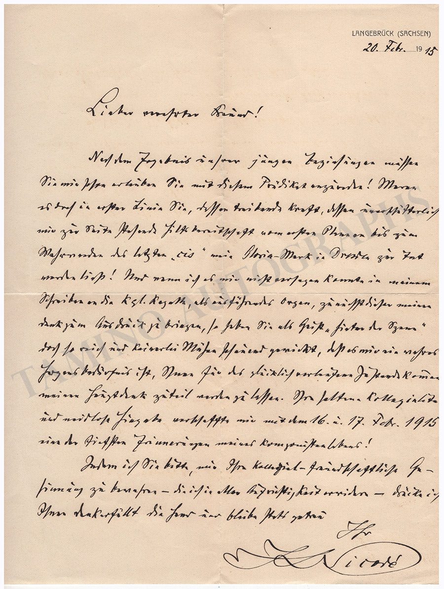 Fine autograph letter in German (untranslated) signed by him, dated 20 Febr. 1915, where he addresses a colleague on music matters. Size is 8.5 x 11.3 inches, 1 written page, folds, dirt stains, in overall very good condition.