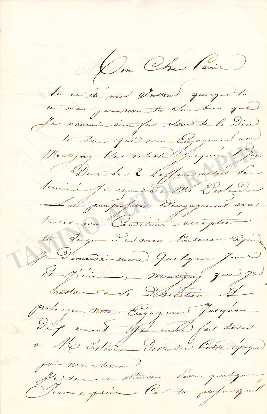 Autograph letter in French signed by him, dated on verso in 1844 (untranslated). Size is 5.25 x 8.3 inches, two written pages in one sheet (front and back), in excellent condition.