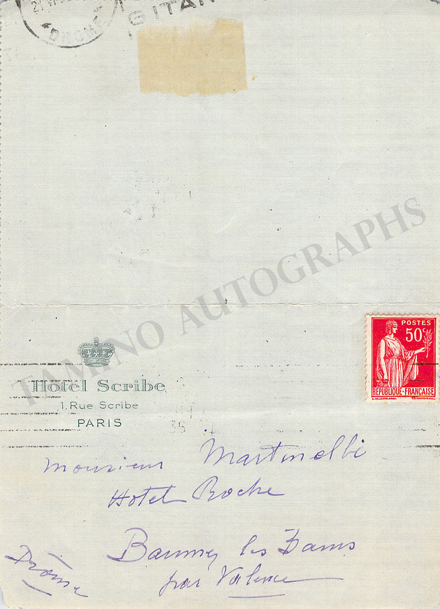 Autograph letter in French (untranslated) signed by him. Size is 4.6 x 6.3 inches, 1 page, no date, in very good condition.
