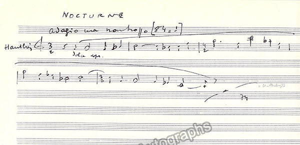 5-bar autograph note from his Nocturne signed by him in 1974. Size is 8.5 x 4 inches, in excellent condition.