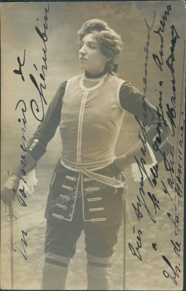 Belgian mezzo (1875-1953), beautiful signed photo postcard, shown as Cherubino, in Le Nozze di Figaro (opera by Mozart), inscribed, 3.5 x 5.5 inches.