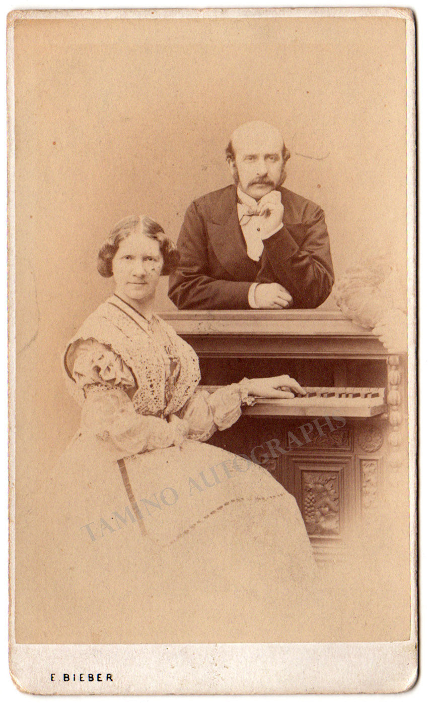 Beautiful carte-de-visite (CDV) photo of the couple by photographer E. Bieber (Hamburg) signed by both artists on verso in May 1869. Size is 2.5 x 4.2 inches, rust stains on verso, otherwise in very good condition.