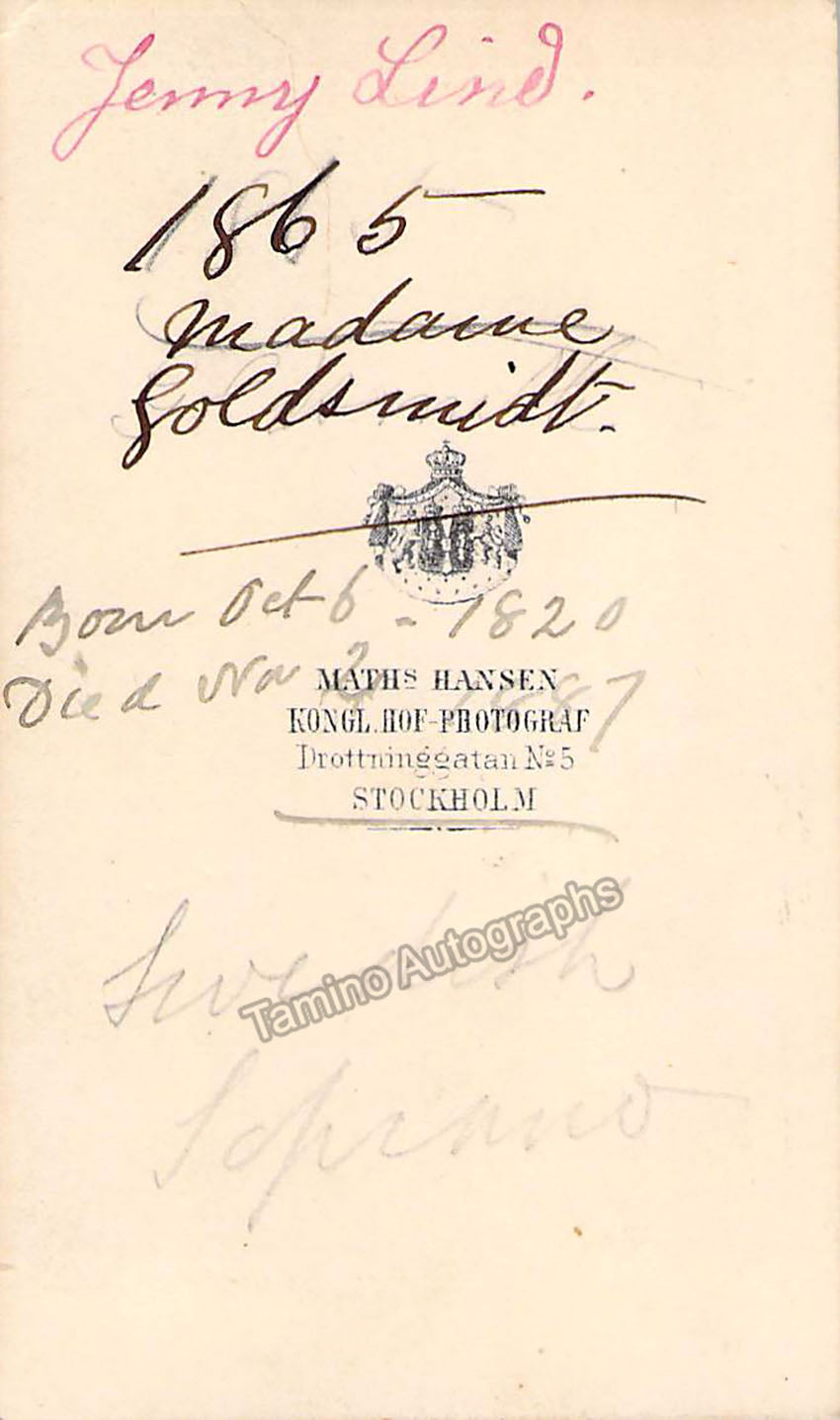 Unsigned Carte-de-Visite (CDV) of the star soprano shown as herself by photographer Matthew Hansen, Stockholm.  Size is 2.4 x 3.9 inches, ink markings on verso indicating the year 1865, minor stains on the front, otherwise in excellent condition.
