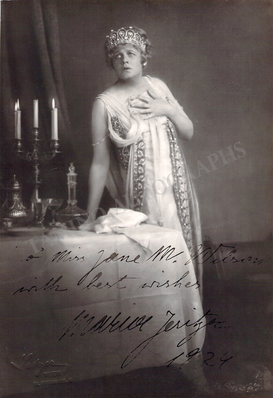 Gorgeous black-and-white vintage photograph signed and inscribed by her with a short sentiment dated 1924, shown as Tosca in Puccini's opera; blind-stamped over the lower-left front and ink-stamped on verso by photographer Setzer (Vienna).