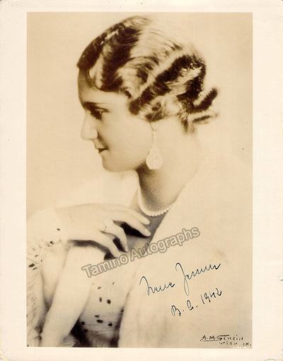Signed photograph, shown as herself, dated in 1942. Hand-written signature on front of photographer A.M. Schein, Vienna. Size is 8 x 10 inches, small creases on edges, otherwise in very good condition.