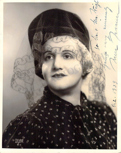 Signed photograph, shown as herself or possibly in role, inscribed and dated in 1939. Stamped on verso by photographer Delar, New York. Size is 8 x 10 inches, small creases on various corners, otherwise in excellent condition.