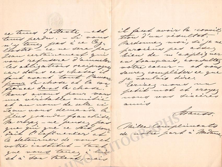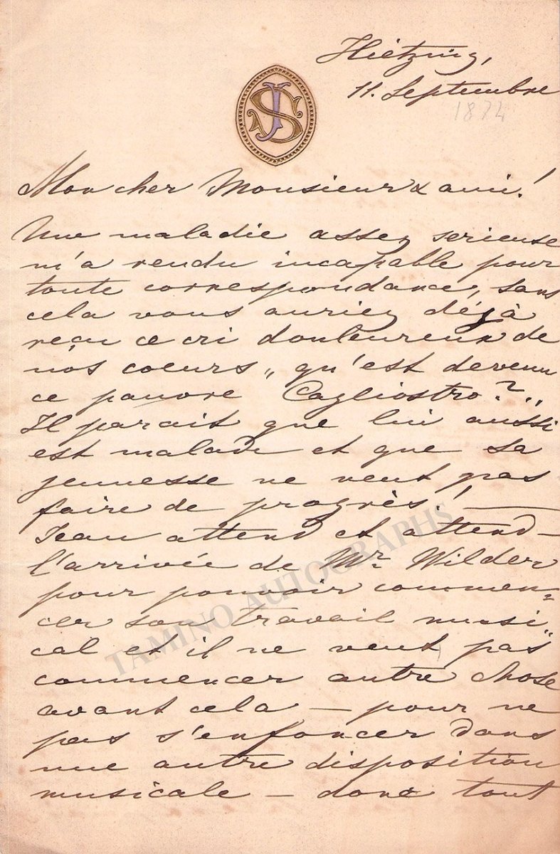 Autograph letter signed by her, written in French (sold untranslated) with letterhead initials. Pencil marks by another hand indicating the year 1874.  Each page's size is 5.2 x 7.74, 3 pages, in excellent condition.