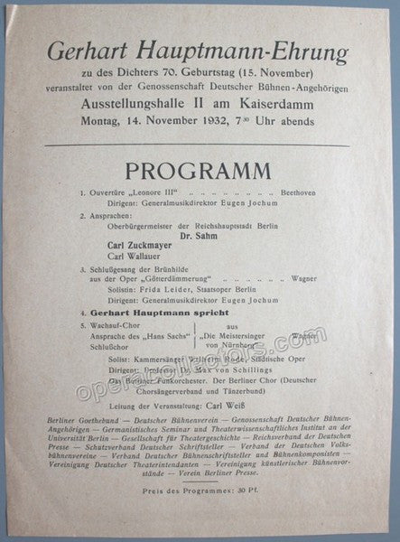 Eugen Jochum, Max von Schillings, Frieda Leider. Berlin, November 14th, 1932. Concert for the 70th birthday of the writer Gerhart Hauptmann. Eugen Jochum and Max von Schillings conduct Beethoven and Wagner. Soloists : Frieda Leider and Wilhelm Rode. Speeches by Carl Zuckmayer, Dr Sahm (mayor of Berlin), Carl Wallauer and Gerhart Hauptmann.
