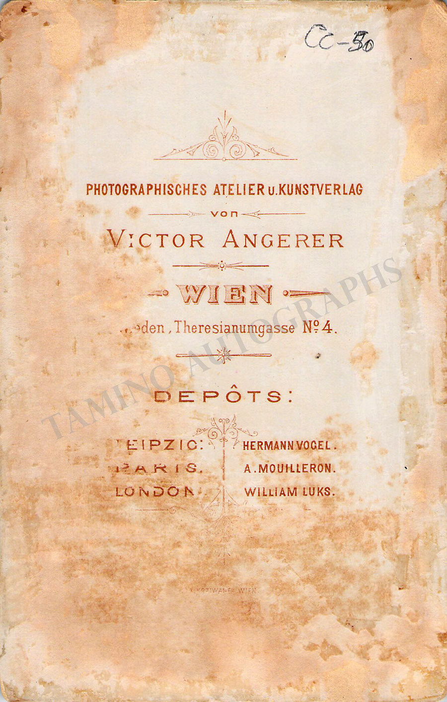 Beautiful vintage cabinet photograph of the composer by photographer Victor Angerer. Size is 4.2 x 6.5 inches, rust stains on the verso and over the upper border in the front, in overall very good condition.