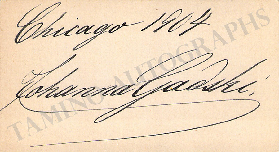 A fine card with her signature dated in Chicago, 1904. Size is 3.8 x 2.1 inches, evident signs of mounting traces on verso, in very good condition.