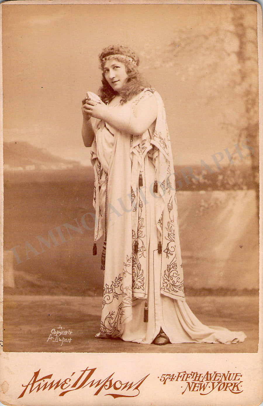 Beautiful (unsigned) cabinet photograph of her as Aida by photographer Aime Dupont (New York). Size is 4.25 x 6.5 inches, in very good condition.