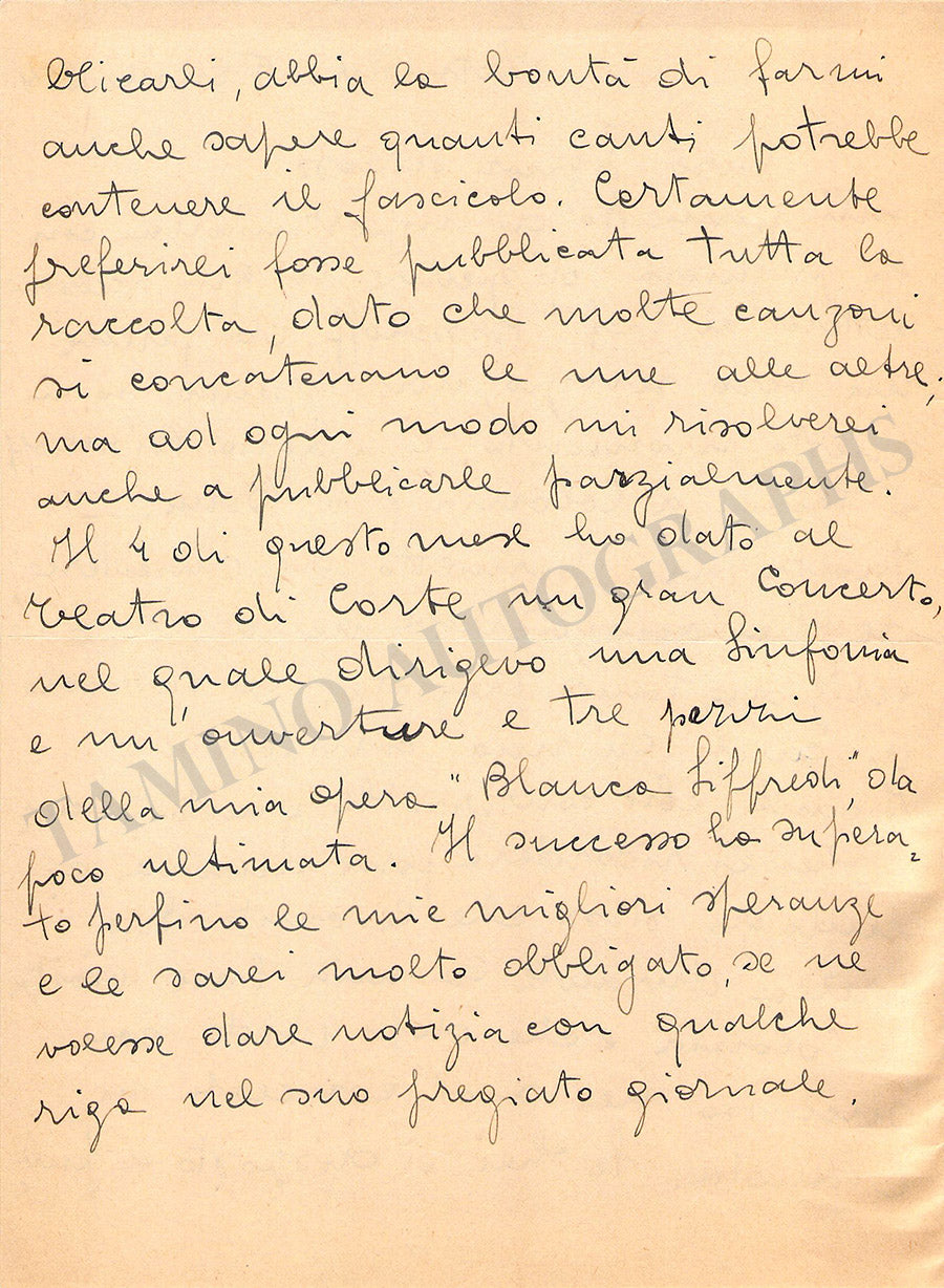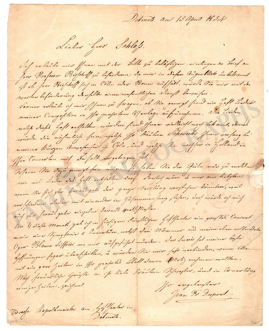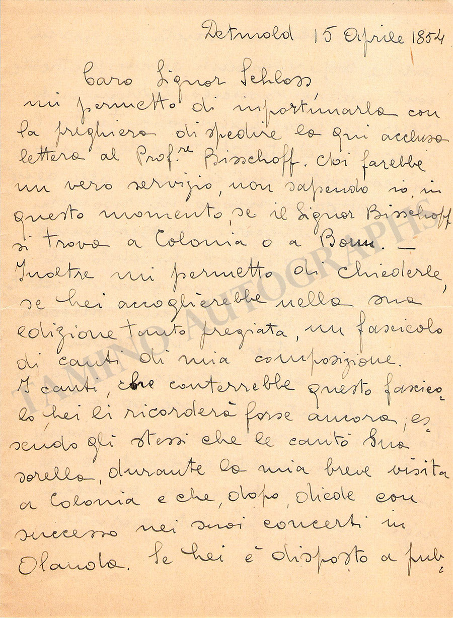 A. Dated in Detmold, April 15, 1854, to the music publisher Schloss in Cologne, asking for the possibility of publishing some of his songs, and mentioning the concert of the 4th of April 1854 at the Court opera theatre where he performed pieces from his recently completed opera “Blanca Siffredi”. Size is 9 x 11 inches, 1 page, folds, smudges, creases, folds, overall age-toning, in good condition. Translation into Italian included.
