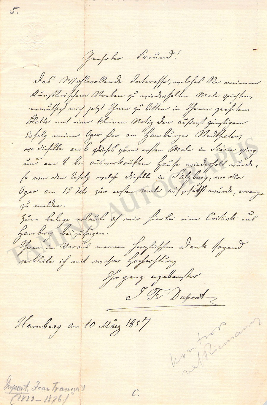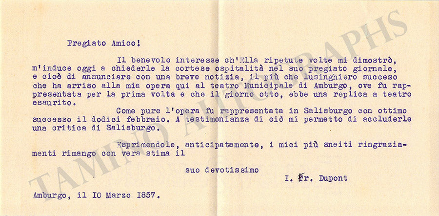B. Dated in Hamburg, March 10, 1857, to the director of a magazine, asking to announce the success of his opera at the Hamburg city theater. Size is 5.1 x 7.8 inches, folds, in very good condition. Translation into Italian included.