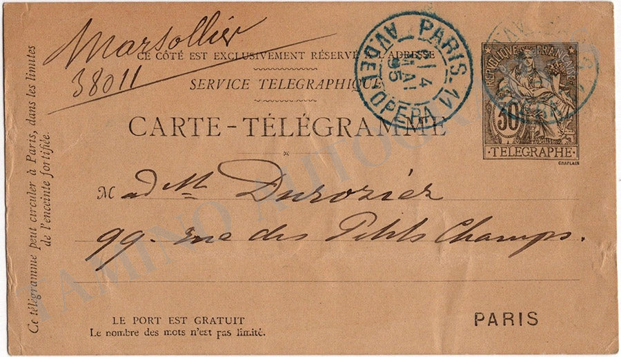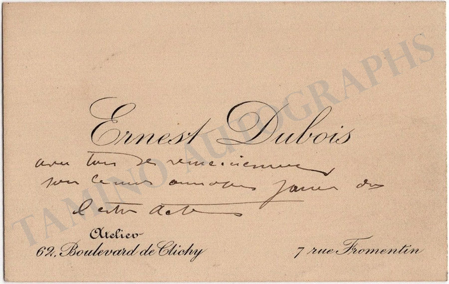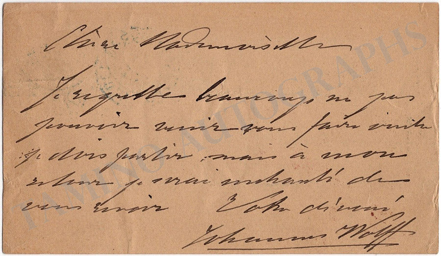 Autograph note signed by him on the French sculptor Ernest Dubois' visiting card, no date [postal markings indicate May 14, 1895].  Wolff addresses Mademoiselle Du Rozier-Magneux, regretting not being able to attend a meeting with her. Size is 5.1 x 3 inches, in overall very good condition.