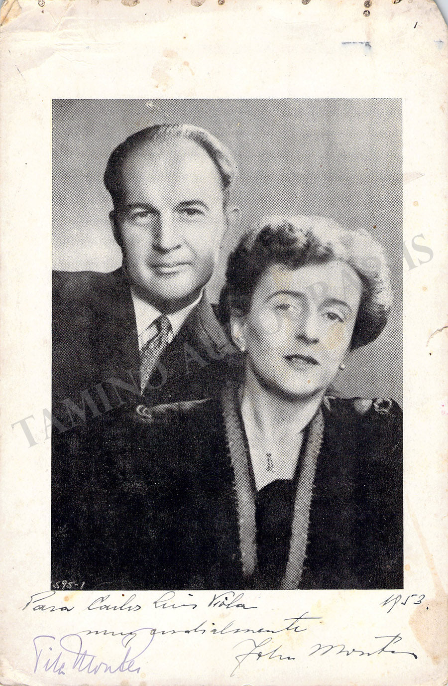 Nice half-tone photograph signed by the couple and dated 1953. Size is 4.75 x 7.3 inches, some stains, and damage over the top, in fair condition.