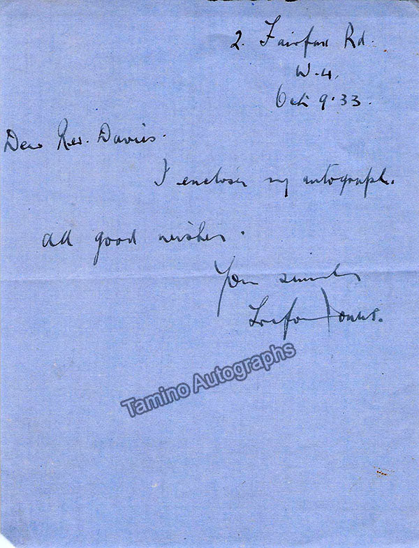 Welsh tenor (1901-1965), autograph note signed, 1 page, dated in 1933. Size is 5 x 6.5 inches, 1 fold, small crease on bottom left, otherwise in excellent condition.