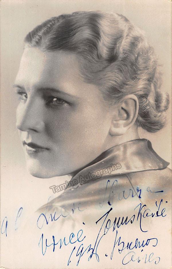 Lithuanian mezzo-soprano (1902-?), signed photo, shown as herself, inscribed and dated in 1938. Stamped on verso by photographer Sudak, Buenos Aires. Size is 3.5 x 5.5 inches.