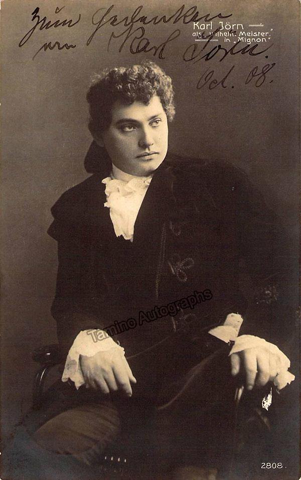 German tenor (1873-1947), (also known as "Carl Jorn"), the first German tenor to make complete opera recordings in 1908. Signed postcard photograph, shown as Wilhelm Meister in Ambroise Thomas's Mignon, dated in 1908. Size is 3.5 x 5.5 inches, attractive vintage item in excellent condition.