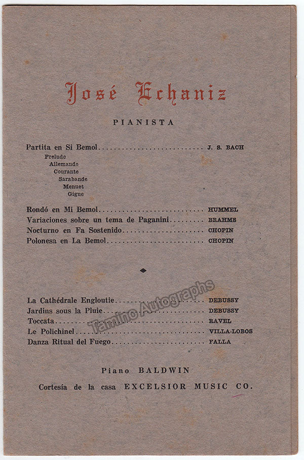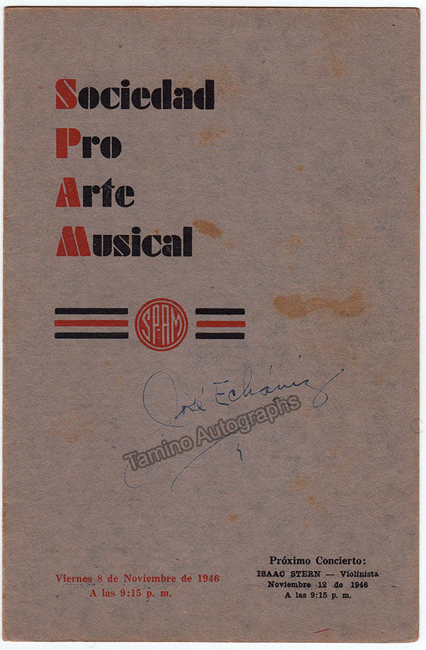 Program for a solo recital of the Cuban-born pianist at SPAM -Sociedad ProArte Musical, Havana, Cuba, on November 8th, 1946, signed by him on the cover.  Size is 5.4 x 8.6 inches, 4 pages, minor stains, otherwise in very good condition.