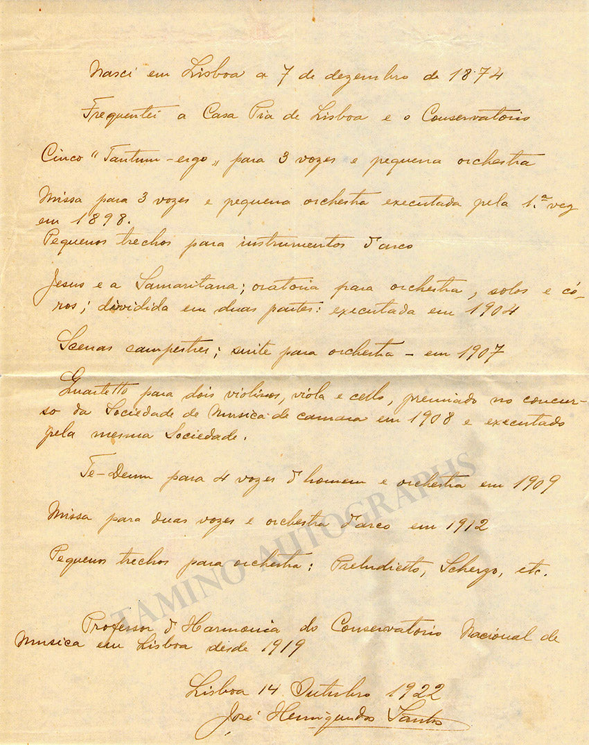 Autograph letter in Portuguese signed by him, dated October 14, 1922, mentioning some of his accomplishments and accolades as a composer and some of his works.  Size