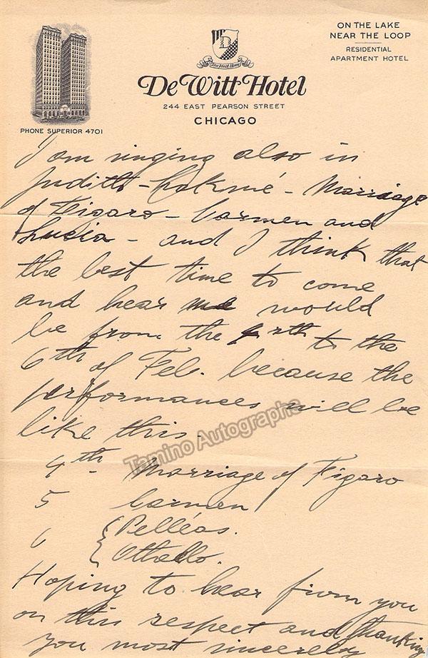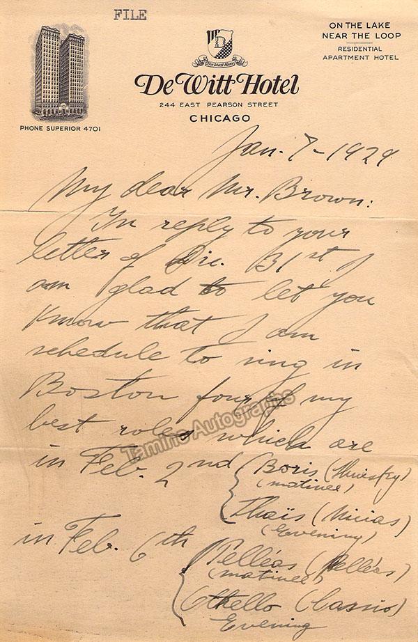 Mexican tenor (1895-1974) who starred in the world premiere performances of Sergei Prokofiev's Love For Three Oranges.  Autograph letter signed, in English, dated in 1929. Hand-written on three successive pages detailing his recent and upcoming performances. Size is 5.4 x 8.3 inches, slight tear on top third of each page, but otherwise in good condition.