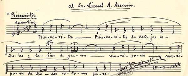 Lengthy Autograph music quote with 11 bars of his famous song "Princesita", signed, inscribed, and dated by him in 1944.  Size is 9.1 x 3.75 inches, in excellent condition.