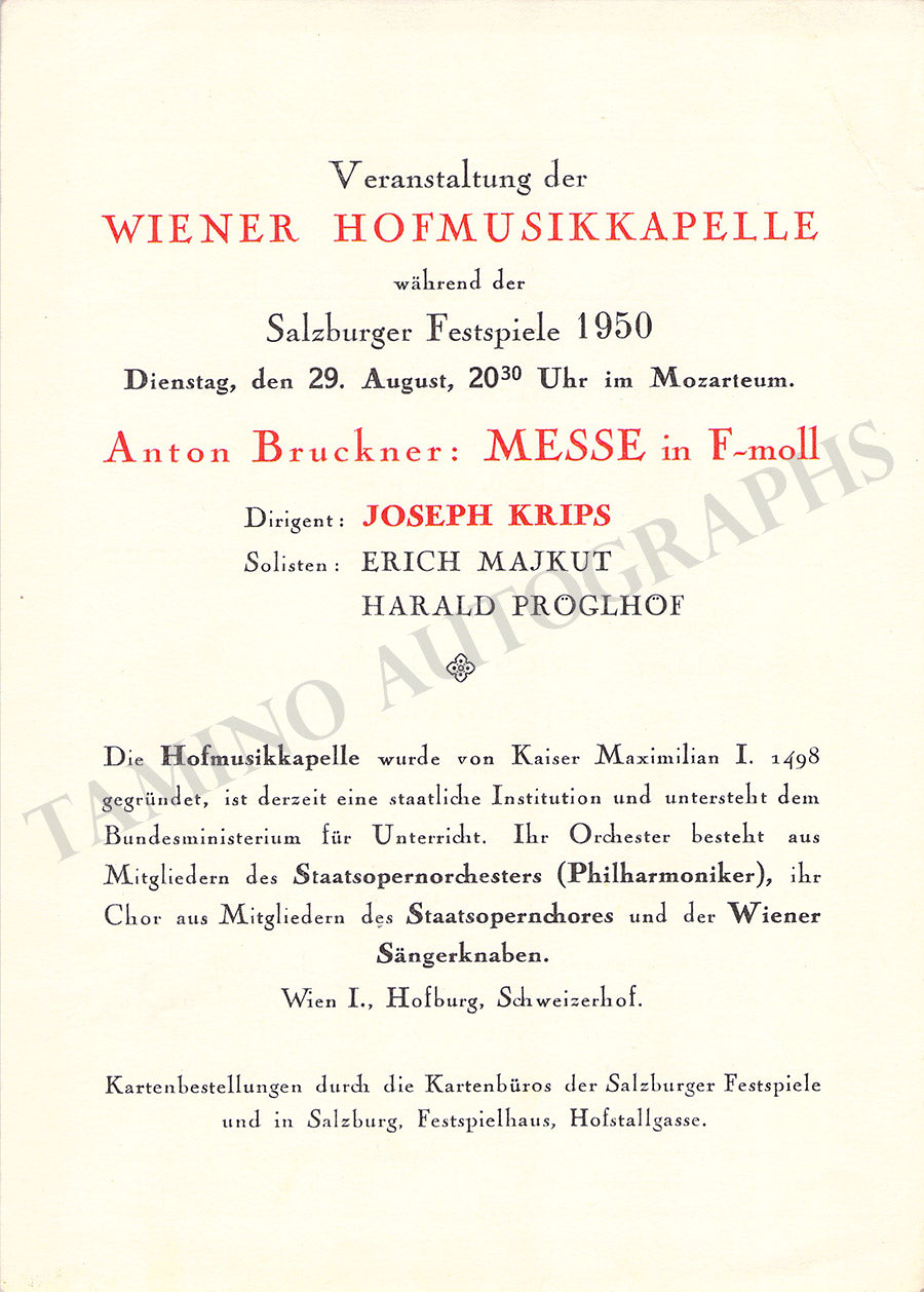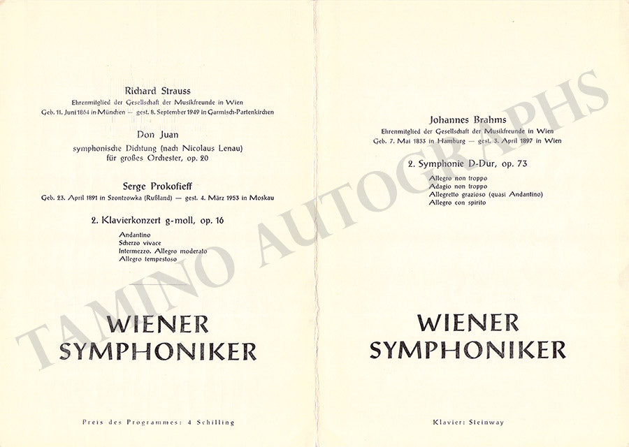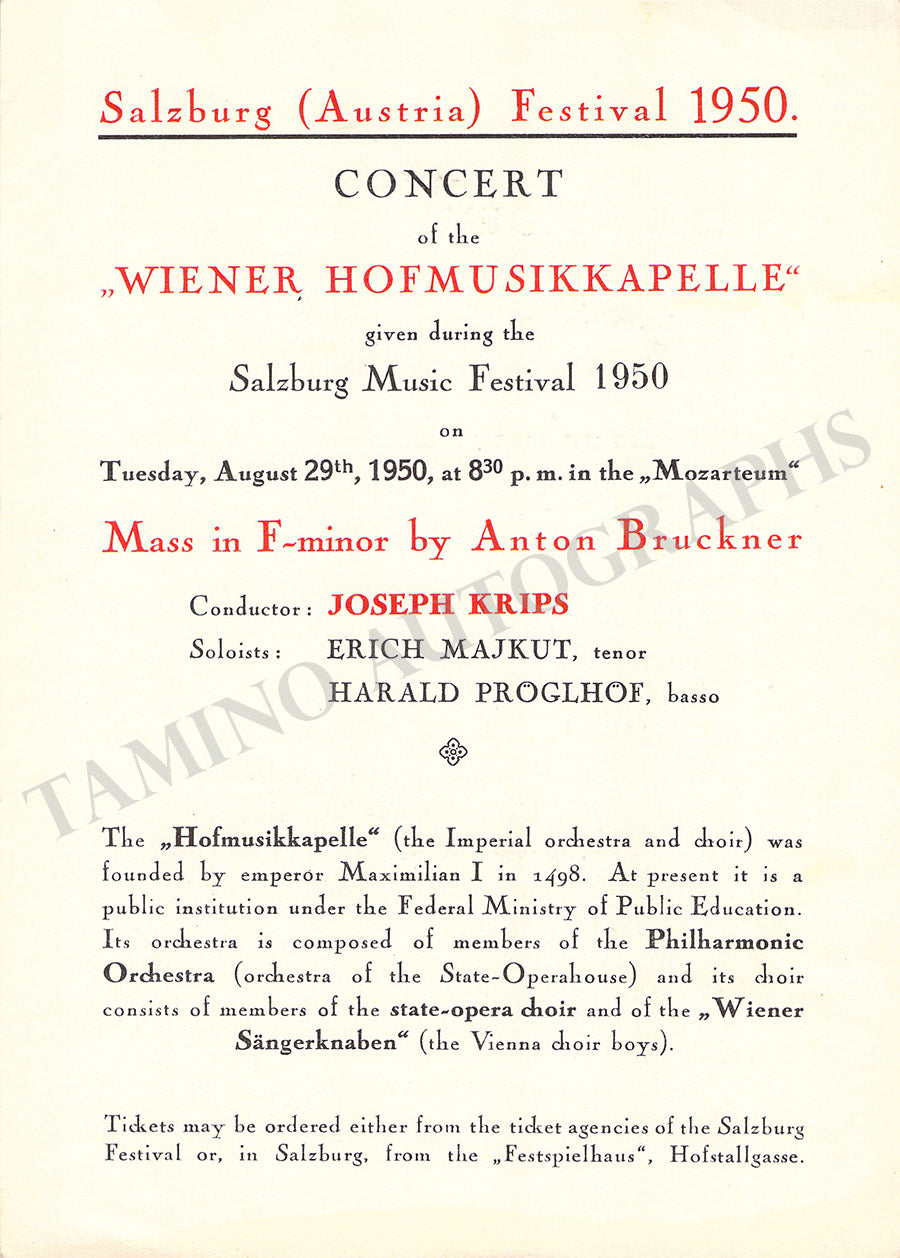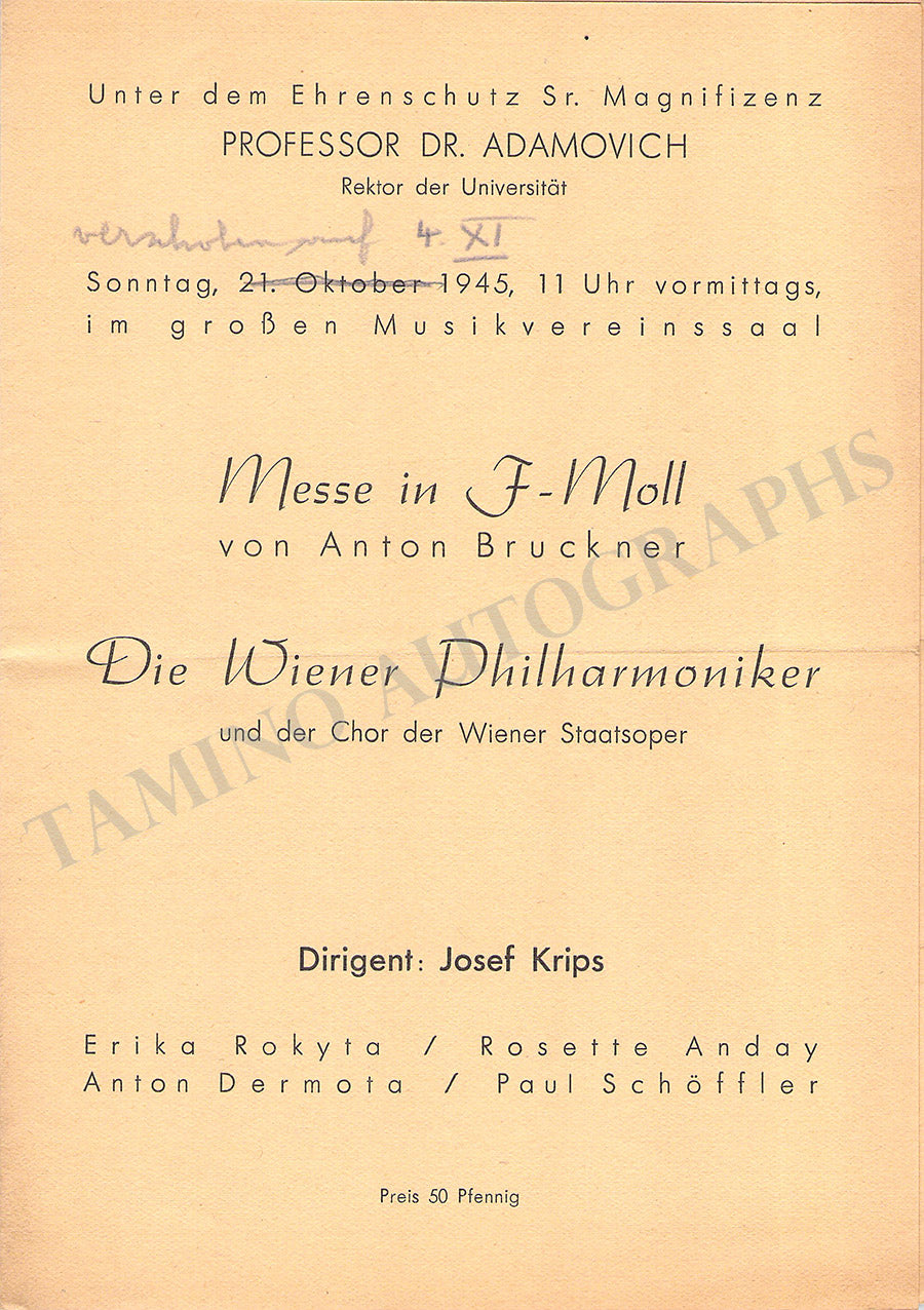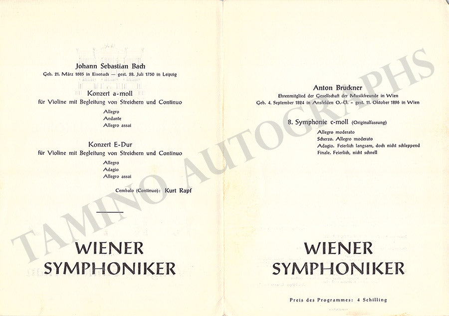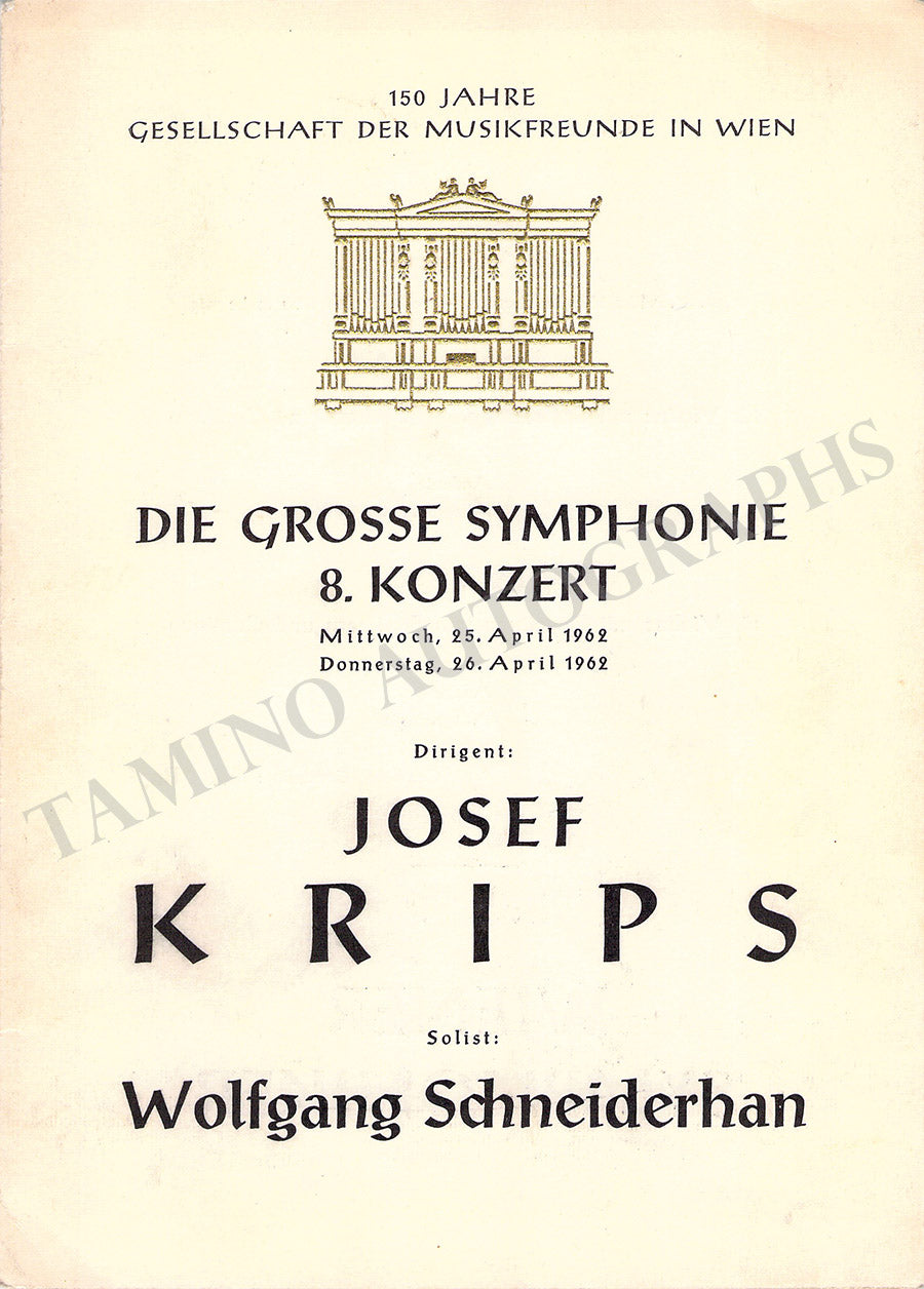 Fine set of 15 unsigned concert programs for performances conducted by the celebrated conductor in Vienna between 1937-1966. Most of the programs are 5.8 x 8.25 inches in size, full programs with all pages and covers, in very good condition or better.