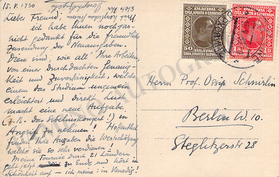 Fine photo postcard with his image signed by him on verso with a long autograph note dated May 15, 1930, addressed to professor Ossip Schmirlin. Size is 3.4 x 5.4 inches, light creases, in overall very good condition.