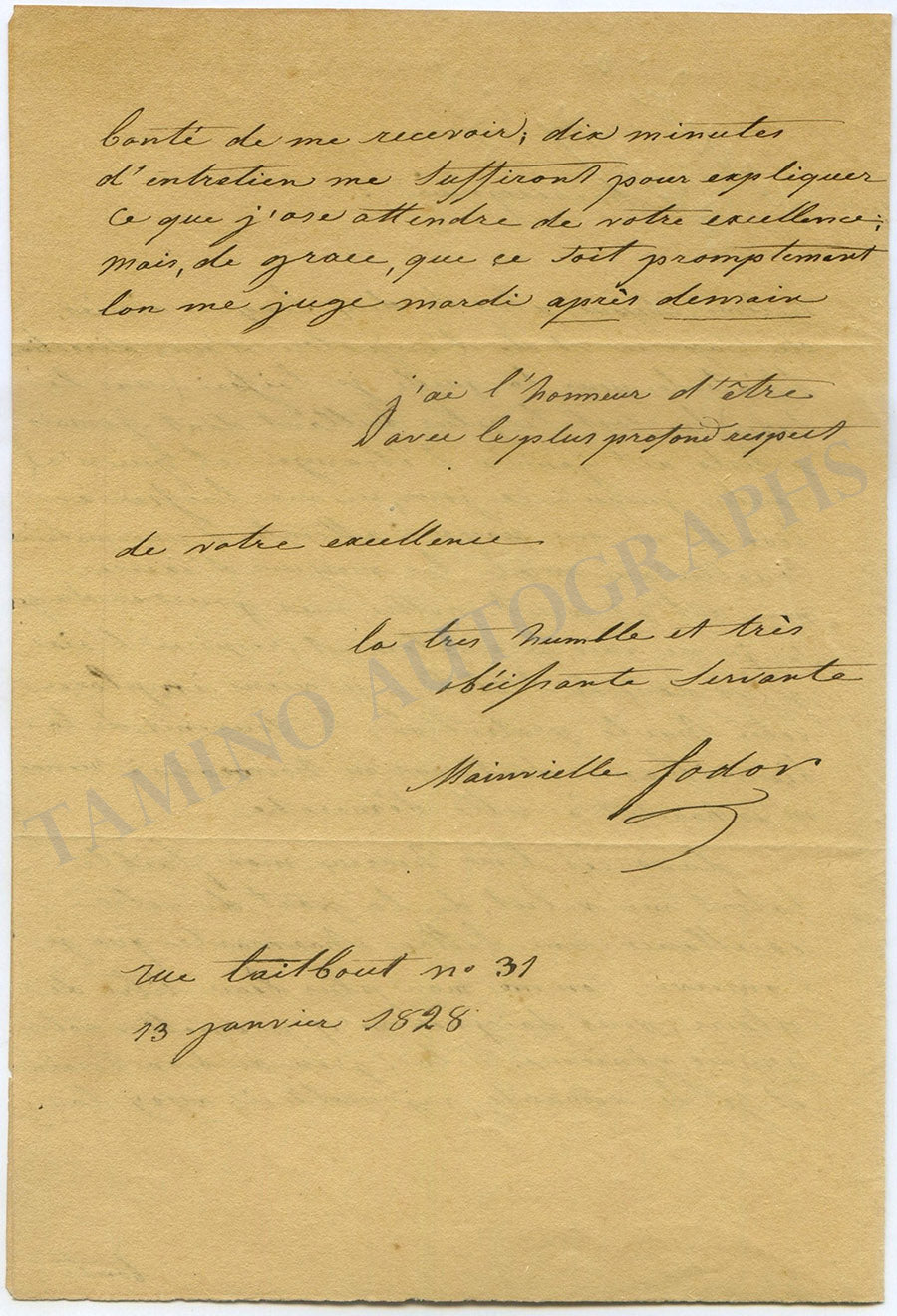 “…Victime, depuis plus de deux longues années du caprice et de l’injustice d’une direction théâtrale pour la quelle je laissai (vous le savez) le sort le plus brillant dont jamais artiste ait joui à l’étranger et qui n’a voulu, jusqu’à ce jour, ni me laisser en liberté ni me payer: atteinte d’une maladie cruelle qui m’ôte les moyens d’exercer mon art et peut mettre mes jours en danger si je ne vais, promptement, respirer l’air plus doux de l’Italie; je vien implorer votre haute protection; le souvenir de la bienveillance dont vous m’honorâtes à Vienne m’enhardit à cette démarche…”.