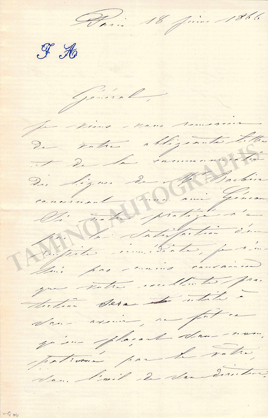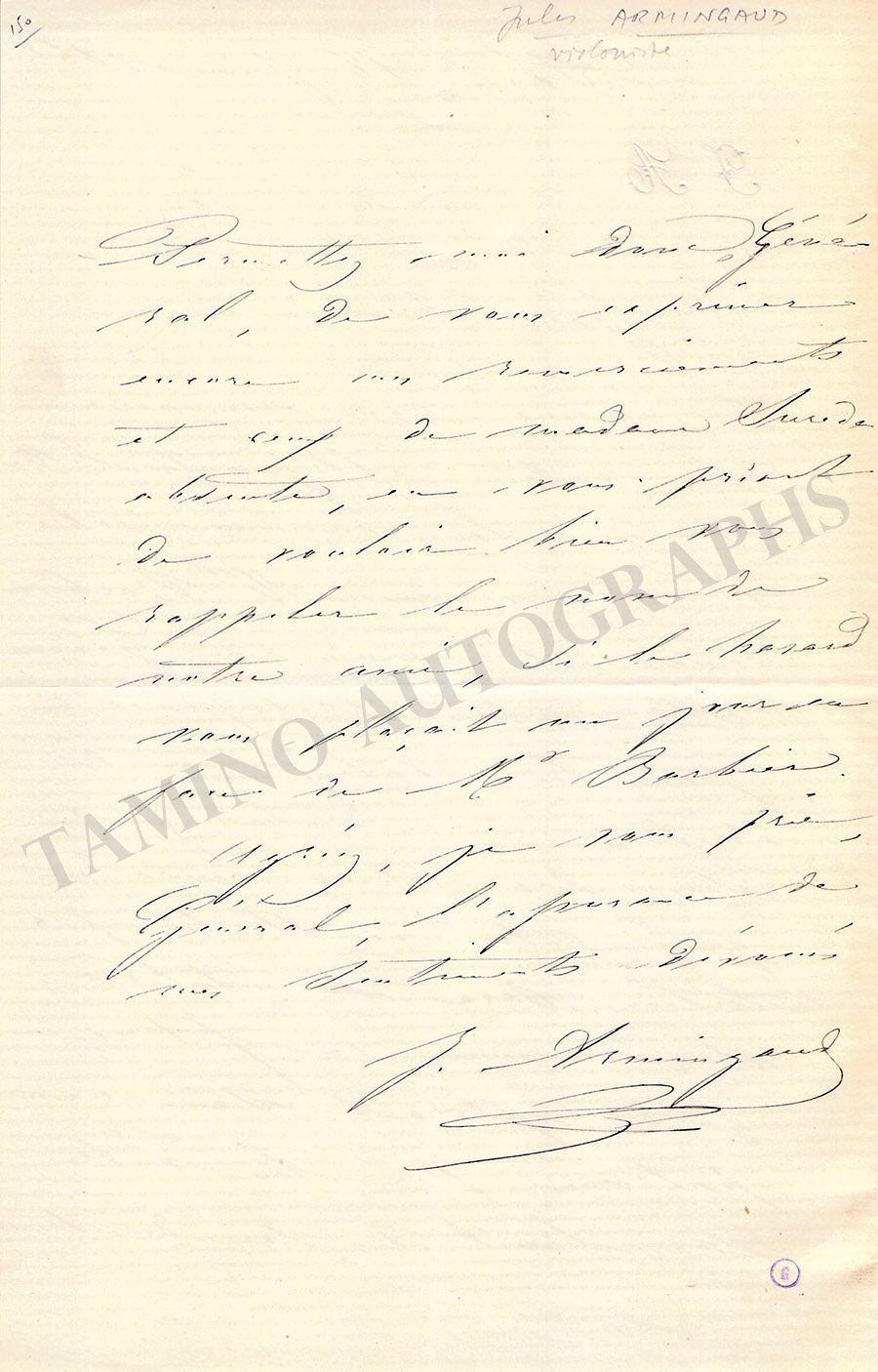 Autograph letter in French (sold untranslated) signed by him as "J. Armingaud" dated in Paris, June 18, 1866, thanking for the interest in his protégé, whose addressee, a general, would like to talk to Barbier. Size is 5.1 x 8 inches, 2 written pages, folds, in very good condition.