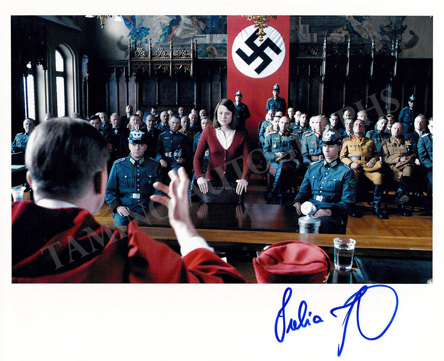 Gorgeous color movie-still photograph of her as Sophie Scholl in the film "The Final Days" (2005) signed by her. Size is 9.75 x 8 inches, in excellent condition.