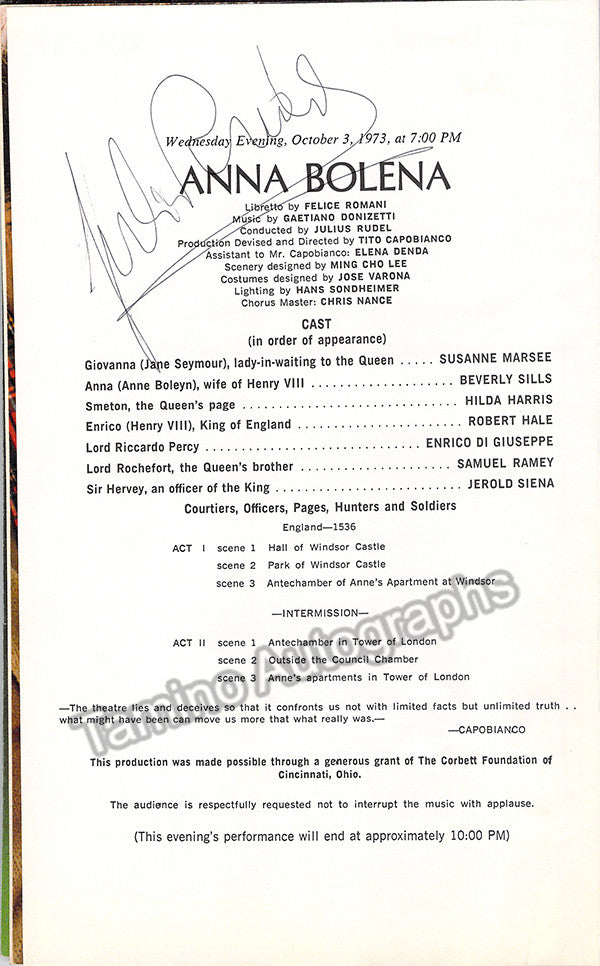 Signed program, Anna Bolena at the NYC Opera, October 3rd, 1973. Full program, 5.5 x 9 inches