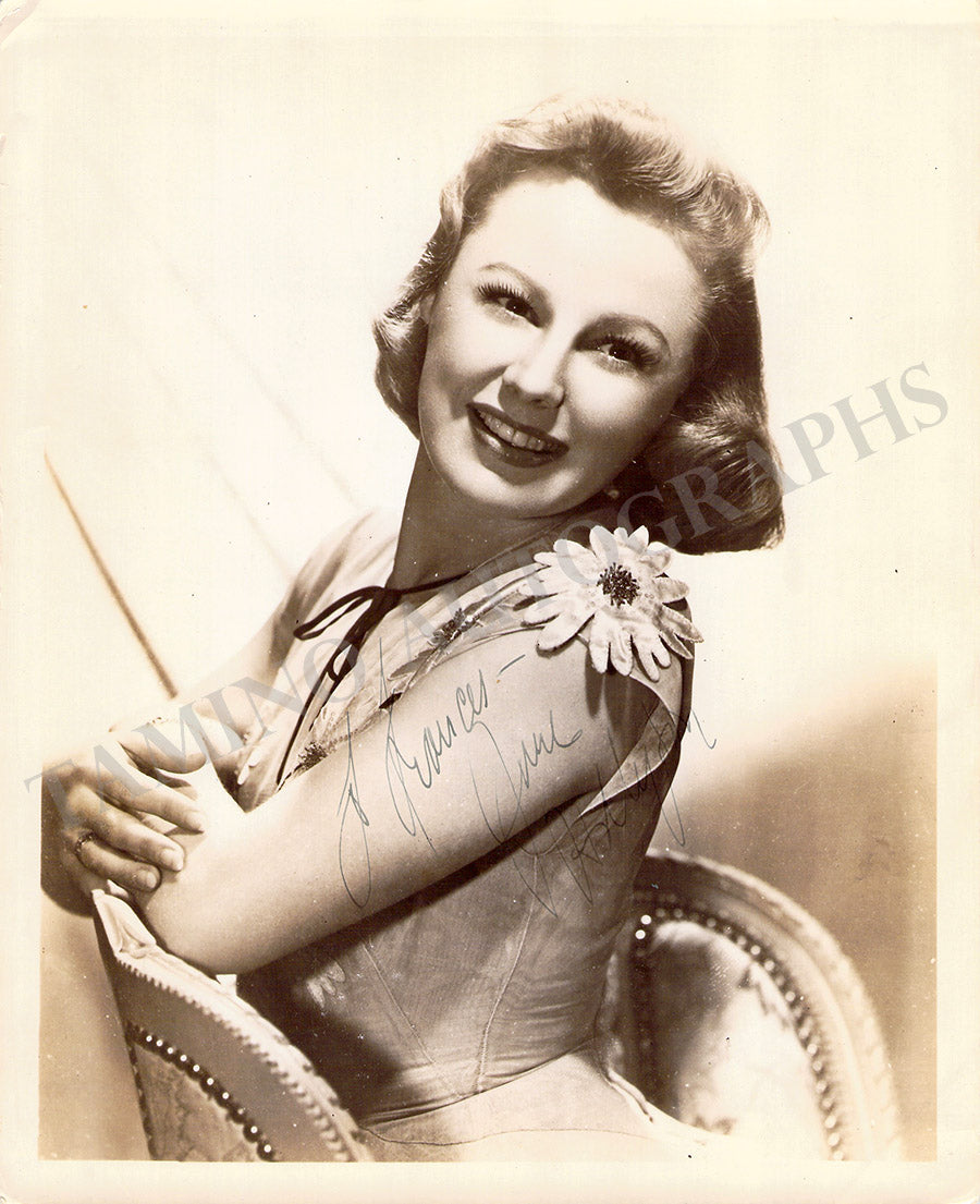 Black-and-white photograph signed by her with a short sentiment, shown probably in a film. Size is 7.9 x 10.2 inches, in excellent condition.