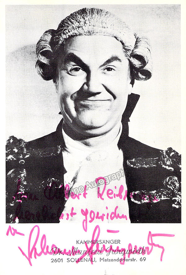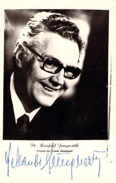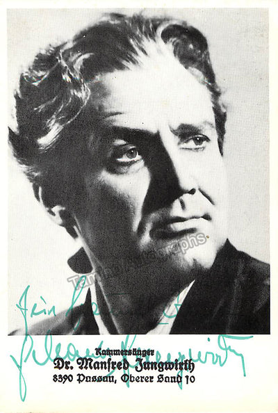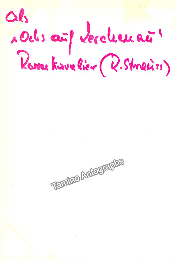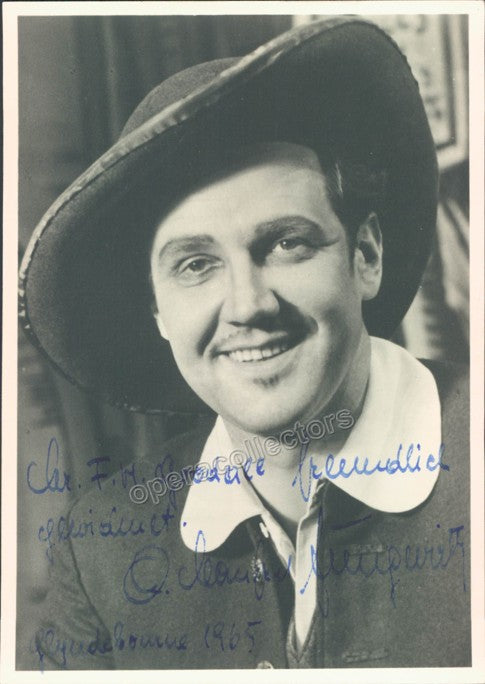 Fine black-and-white promo photograph signed by him on the front with a short sentiment on the verso (not shown), shown as Baron Ochs in Strauss' opera Der Rosenkavalier at Vienna State Opera, 1977. Size is 4.1 x 6.1 inches, ink writing on verso, in excellent condition.