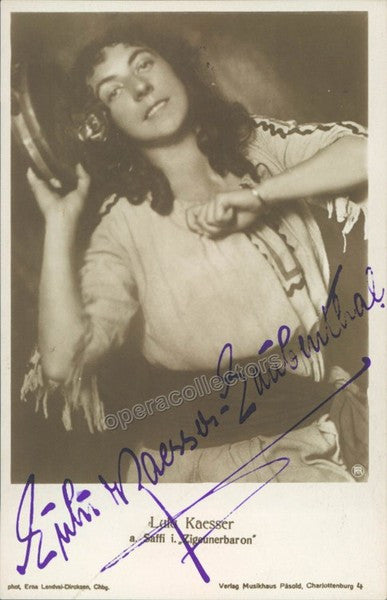 Signed photo postcard of the German soprano (1884-?), signed as Lulu Kaesser-Laubenthal, shown in The Gypsy Baron, 3.25 x 5.25 inches, in excellent condition
