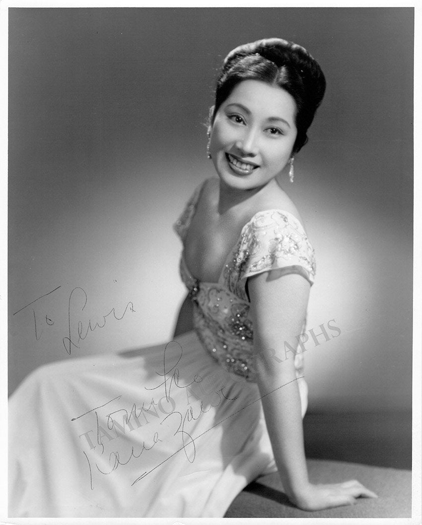 Japanese soprano (1915-?) known especially for her performances of Madama Butterfly, large signed publicity photo, shown as herself. Inscribed. Stamped on verso by photographer Toyo Muyataki, Los Angeles. Size is 7.75 x 9.6 inches, in very good condition.