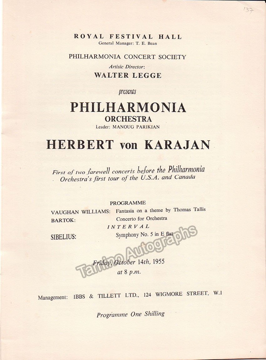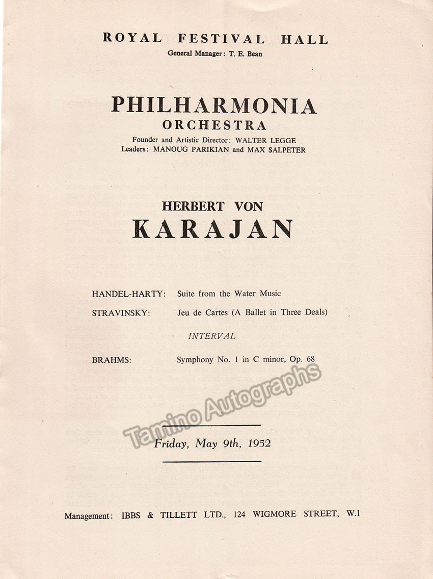 Pair of programs for concerts with the Philharmonia Orchestra in London. May 9th 1952: performance of music by Handel, Stravinsky and Brahms. May 1st, 1955: performance of music by Mozart, Sibelius and Tchaikovsky. Oct 14th, 1955: music by Vaughan Williams, Bartok and Sibelius. Each one is 7.25 x 9.75 inches, 4 pages plus covers, full programs, in very good condition.