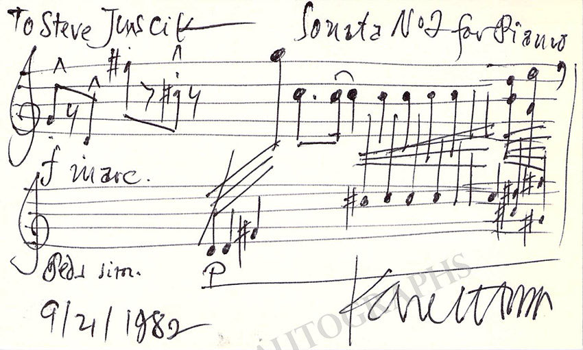 Autograph music quote on a card with 1 bar from his Sonata #2 for piano signed and inscribed by him, dated September 21, 1982. Size is 5 x 3 inches, in excellent condition.