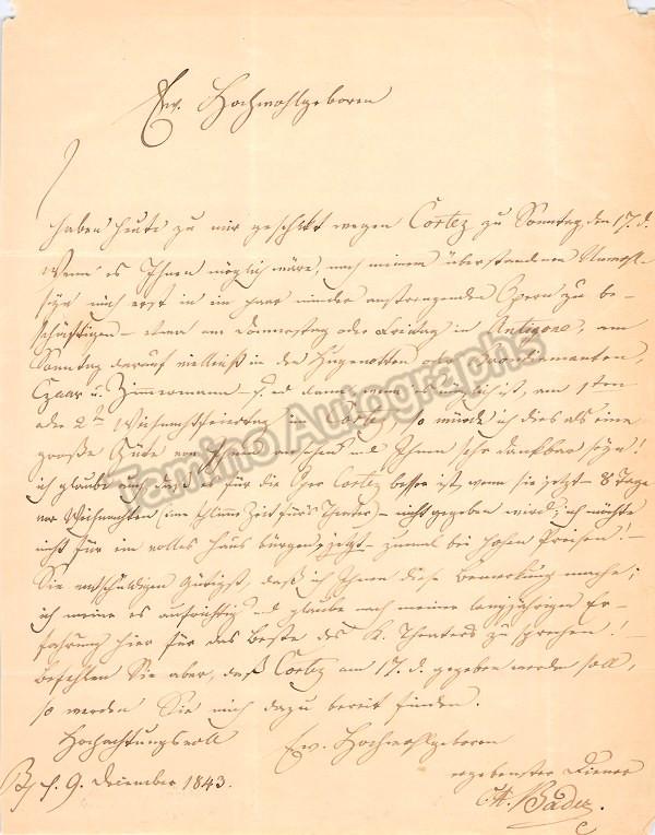 Autograph letter signed and dated by him in 1843, in German, one page, 8.25 x 10.25 inches. Sold untranslated, minor damage on top right and left corners, otherwise in excellent condition.