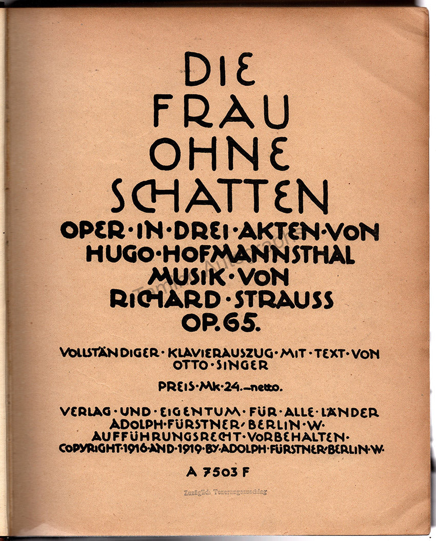 Printed score for voice and piano for the opera Die Frau Ohne Schatten by Richard Strauss, signed on the back of the full title page by Karl Bohm, and inscribed to his friend and New York-based autograph dealer Roger Gross (1938-2013). Probably used by Bohm in one of his rehearsals, dated below by Bohm in Vienna on June 6th, 1960.