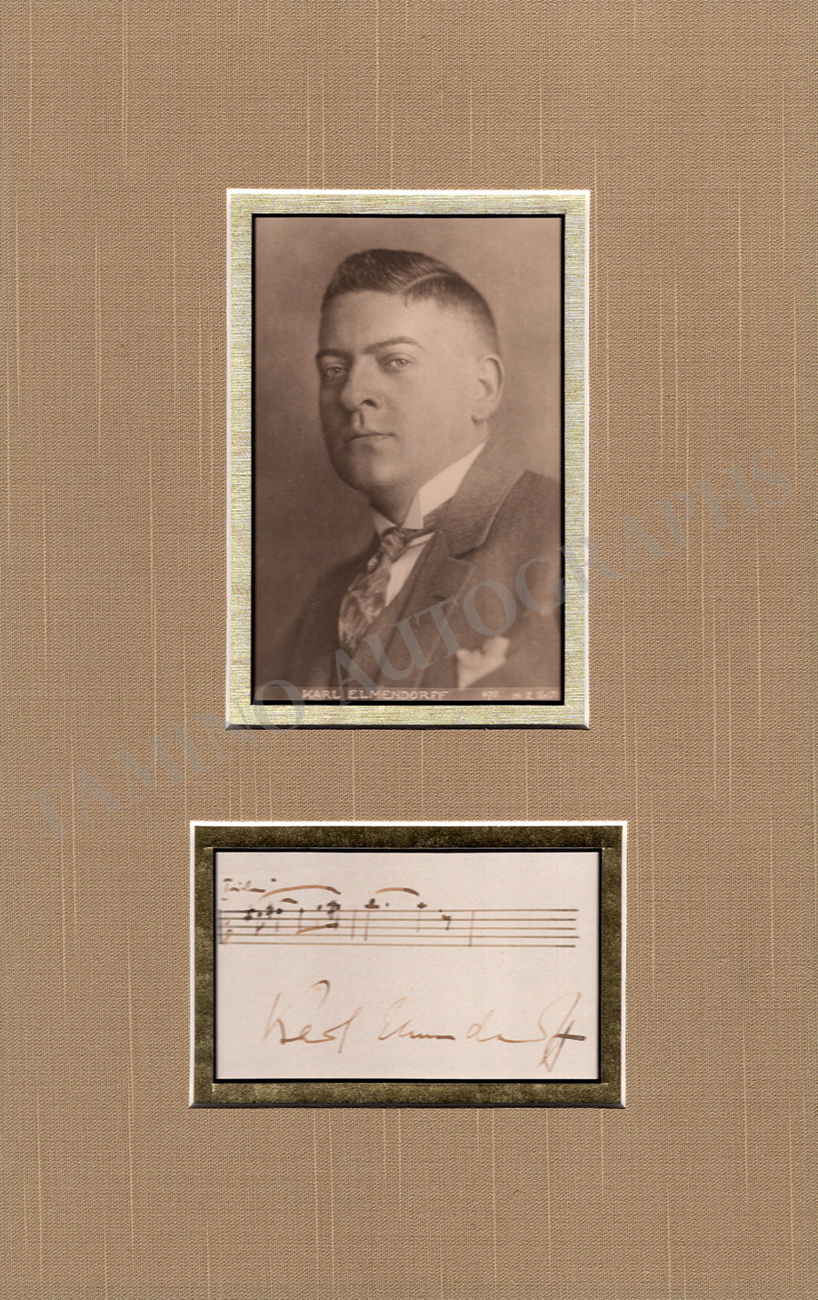 Fine 2-bar autograph music quote from "Tristan und Isolde" signed by him, matted together with a photo postcard of him. Total size is 8.2 x 13 inches, music quote is 3.75 x 2.3 inches (visible window size), photo postcard id 3.1 x 4.8 inches (visible window size), in excellent condition.