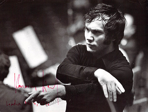 Nice black-and-white photograph signed by him, shown in rehearsal; ink-stamped on verso by photographer Jan Zegalski. Size is 9.4 x 7.2 inches, in excellent condition.