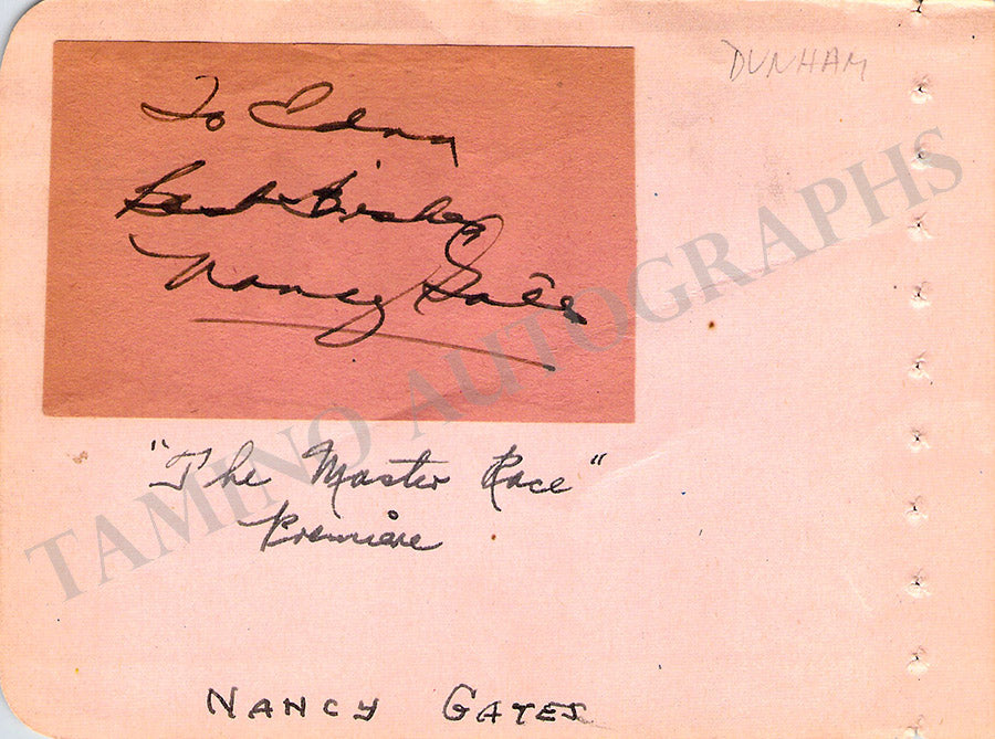Album page signed and inscribed by her with a short sentiment. Also signed on verso by the American actress Nancy Gayes. Size is 5.8 x 4.3 inches, in very good condition.