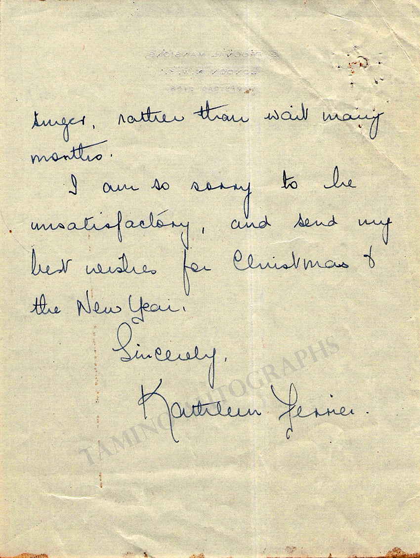 Autograph letter with top letterhead with her address in London, written in English about her trip to America and schedule, signed by her, dated on December 17th, 1949.  Size is 5.25 x 6.8 inches, 1 sheet (written on both sides), minor stains over the lower border, pinholes over the upper-left corner, otherwise in very good condition.