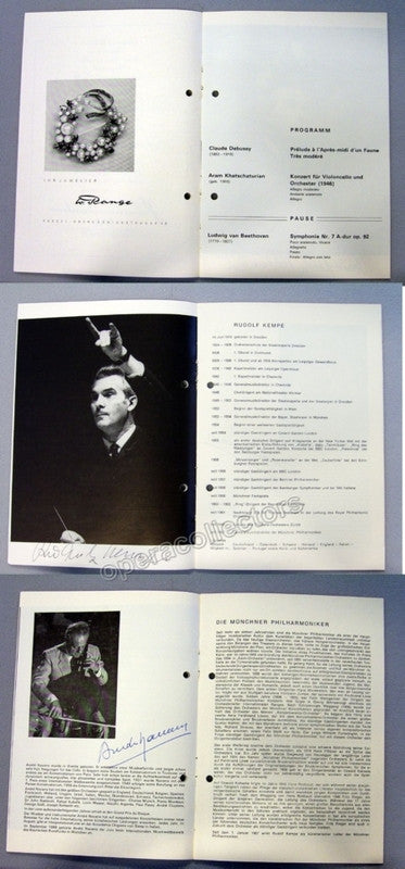 Concert in Kassel, 9. April 1970. Debussy Prélude à l'après midi d'un faune - Katchaturian Celloconcerto - Beethoven Symphony No. 7. André Navarra, cello. Two signed photographs : signed full page portrait of Rudolf Kempe conducting & signed photograph André Navarra playing cello. Paperback, 21 x15 cm, 16 pages, excellent condition with two storage holes + 3 newspaper clippings.