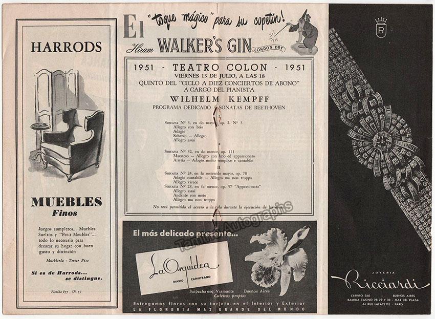 Unsigned concert program for a performance of the star German pianist of an all-Beethoven sonatas program at Teatro Colon, Buenos Aires, on July 13th, 1951.  Size is 6.25 x 9 inches, in excellent condition.