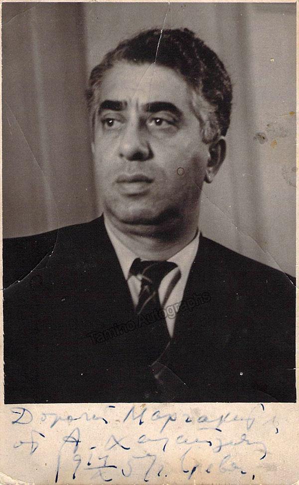Soviet-Armenian composer (1903-1978) and conductor, considered one of the leading Soviet composers of his time.  Great black and white photograph signed and inscribed by him, dated in 1957, shown young.  Size is 3.3 x 5.3 inches, creases, in good condition.