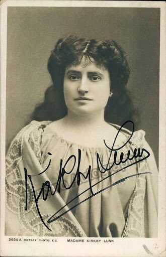 Signed photo postcard of the English contralto (1873-1930) as herself, 3.5 x 5.5 inches.