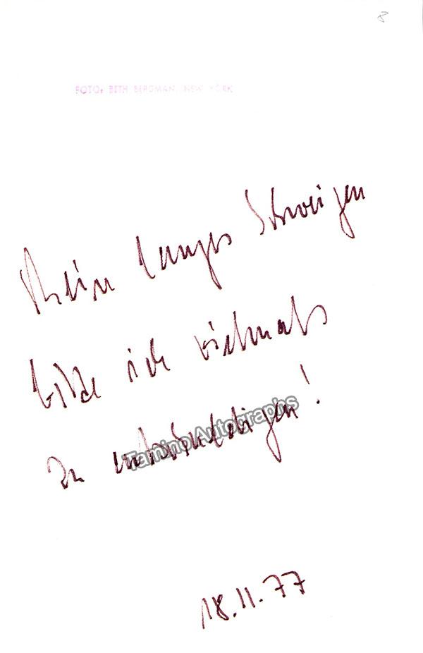 Signed photo, shown as herself, signed on front with additional inscription on verso, dated in 1977. Stamped on verso by photographer Beth Bergman, New York. Size is 4 x 6 inches, in excellent condition.